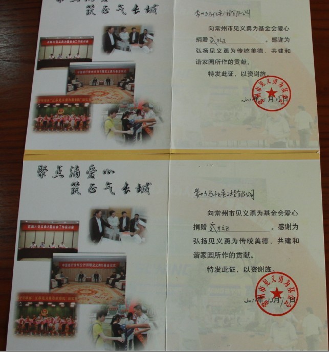 自11月份力馬企業(yè)向常州市見義勇為基金會(huì)愛心捐贈(zèng)20’000元后,常州市精神文明建設(shè)專題會(huì)議上,市委領(lǐng)導(dǎo)對(duì)民營企業(yè)關(guān)愛見義勇為人員、弘揚(yáng)見義勇為精神的舉動(dòng)作了高度評(píng)價(jià)。12月份,常州力馬干燥工程有限公司再次向常州市見義勇為基金會(huì)捐贈(zèng)20’000元。